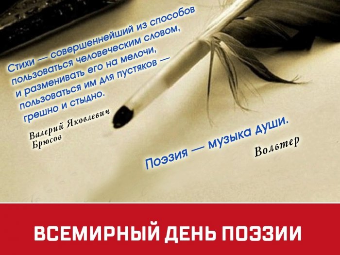 Всемирный день — поэзии-это повод почтить поэтов, возродить устные традиции поэтических чтений. Поэзия продолжает объединять людей всех континентов.