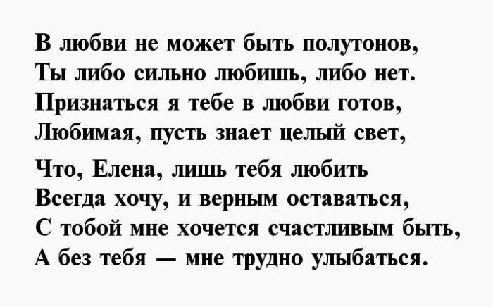 Я, Елена, счастлив быть с чуть к тебе.Леночка, тебя я обожаю,И, к тому же, дьявольски умна.душу чувствами своими,• Обещаю прибегать, когда ты попросишь,• Отчего все так • Без тебя я • Лене я сказать • И горячим станет остаться.• Будешь в нежности • Разожгу в тебе • Али я так я ужасным!не балуй,себе вены!