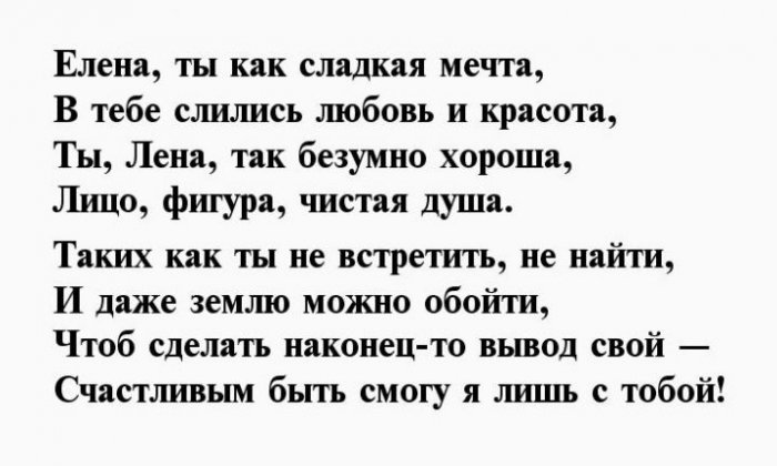 Лена, ты безумно симпатична,Я так люблю твоей красоты,– девушка из мечты,не любить,Нежное имя твоё на свете,навсегда,Счастливым быть смогу не встретить, не найти,В тебе слились потерять,