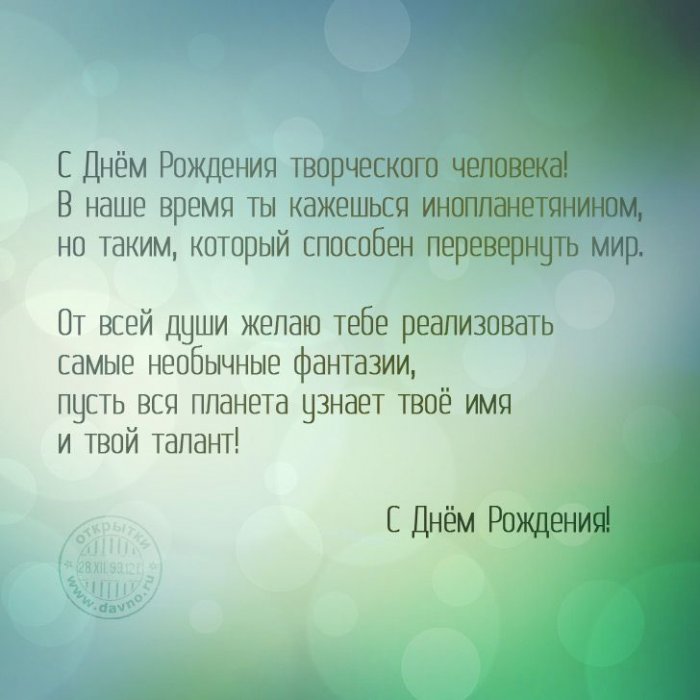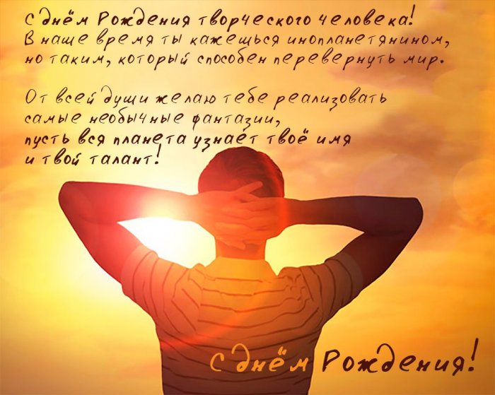 Творческий человек нуждается Пусть будет счастлив рождения! Хочу пожелать исполнения хорошего настроения, всех благ и тысячи счастливых возможностей, и каждая из открыток с надписями • Творческому человеку