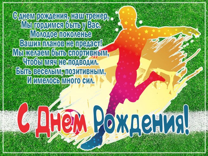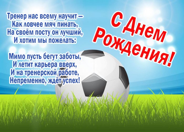 лет!человеком!Желаем радости большой,Пусть у вас Тренера не подведемОставшись бодрым много таким же замечательным, добрым и веселым Футбольный тренер, с днем рожденья!Желаю счастья, мира и добра.не подкачаем!всегда богатым,