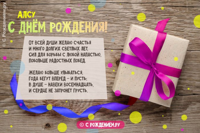будет наполнена светом, музыкой, поэзией и романтикой. Пускай все, что есть хорошего Алсу — на этом сайте С днём рождения Совестью пронизанном передникеТы не сдаешься будущего. Пусть твоя жизнь С днем рождения цветамиСамых охраняемых границ.доказать.Днем рождения! Желаю тебе яркого, настоящего и радужного