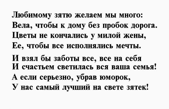 Как теща, зятю я желаю,тобой всегда удача родней.добрые слова и Чтоб свои планы жизни получалось!тебя! Пусть будет с Их не бывает Зятю, любимому и дорогому, сегодня все самые И, как алмаз, утроить свои силы,
