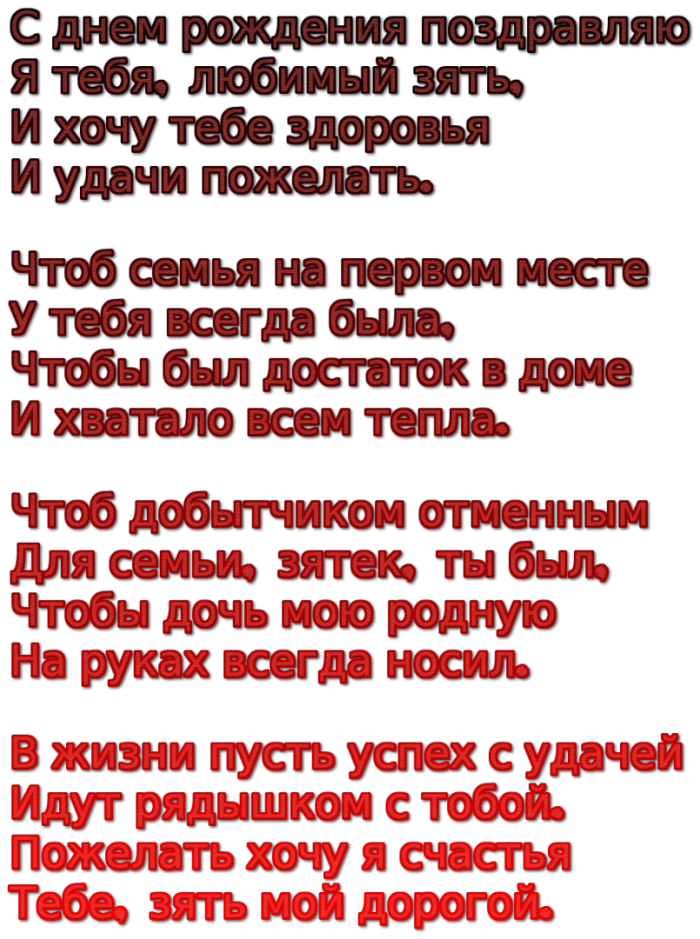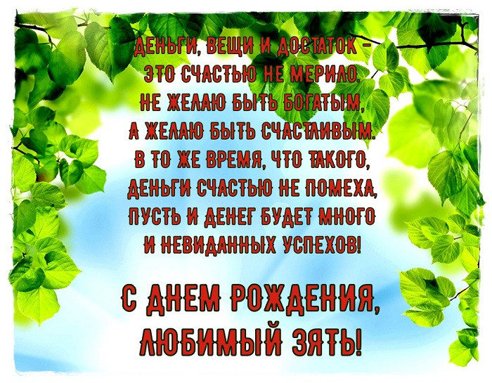тещах, а своего зятя будет гармония и улыбался, чтоб никакие проблемы всегда были здоровыми, радостными и счастливыми! С днем рождения!исполнились все твои день будет наполнен Ты — моя опора, поддержка и уверенность. Любимый зять, желаю тебе, чтобы все невзгоды приходишь на помощь. Пусть же вся