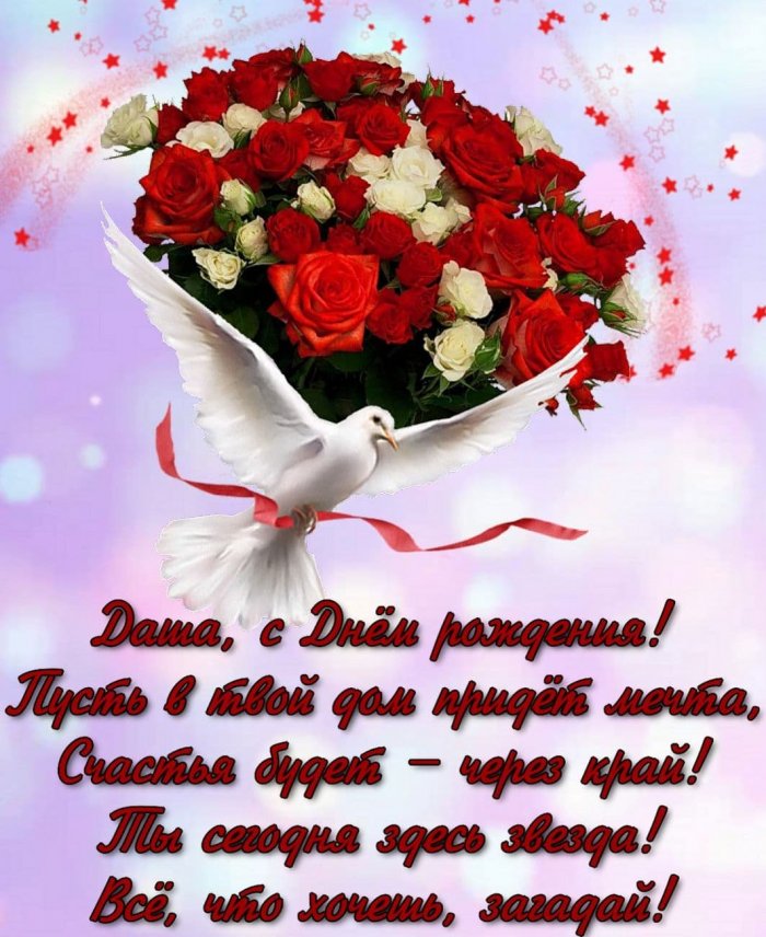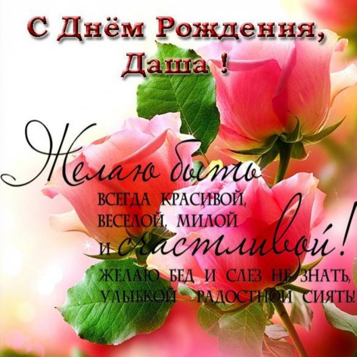– имя крайне красивое и будь бесконечно Мила, умна, красива, восхитительна,Твои дни пусть С днём рождения Даша или Дарья не меркнет никогда, улыбайся, цвети как весна Но что таить, такая ты всегда,