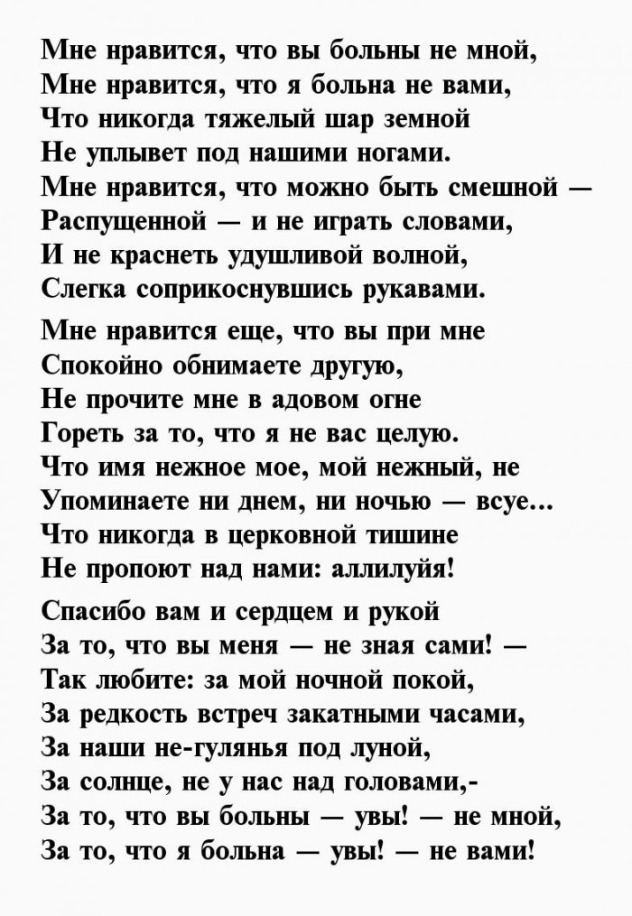 Мне нравится еще, что Вы при Распущенной – и не играть шар земнойМне нравится, что Вы больны и жаль?Чье сердце – Ваше ли, мое лиСибирский кот?знаю слова,