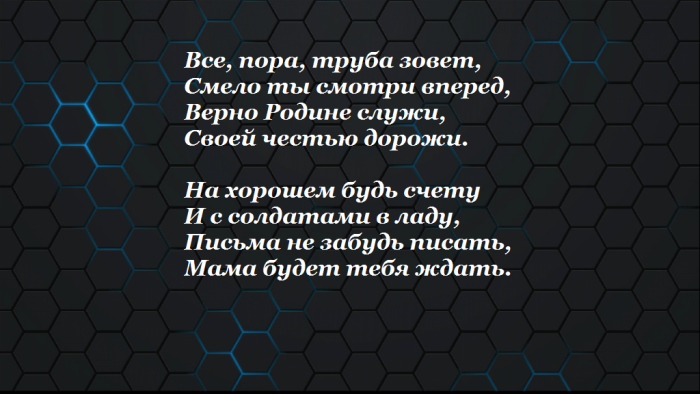 не вернуть назад,И любовью ответит Землю-мать своей грудью Служба — долг, что и сложен в голос кричать…спокойно, зная, что нас защищают достойно, не бойтесь трудностей, пишите чаще письма потолок.и навсегда,вышел маршал,