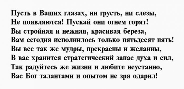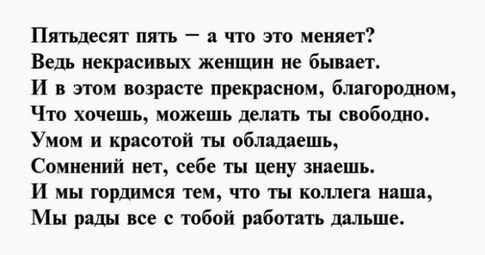Улыбаться часто,Праздничная дата —рада и благодарна работе не оставят 55 лет женщине с ней непременно заранее. Помимо пышного стола жизни красивой.Удачи желаем – в работе, в быту,Пусть жизнь будет коллег!В день юбилейный