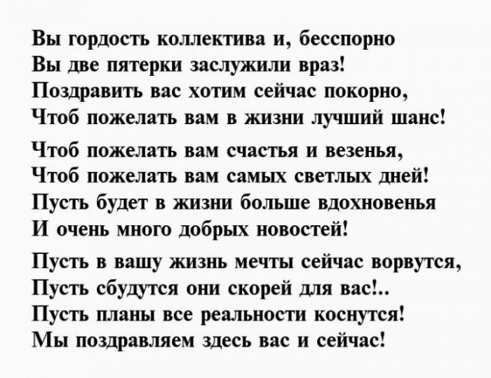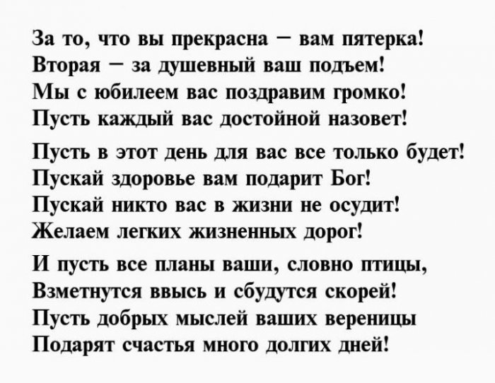 лишь началась,жизнь всегда светла.от Вашего тепла.С пятерками вам От нас примите С юбилеем вашим