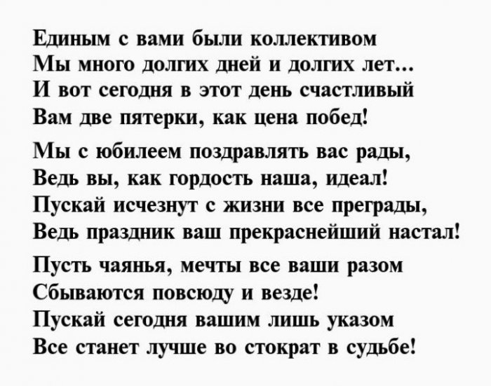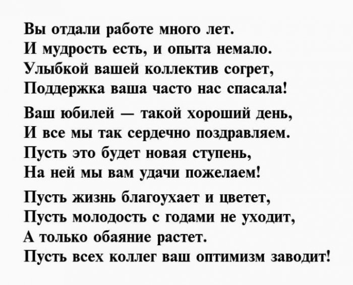 Храните в сердце день счастливый – рожденья светлый день поздравить вас спешим.души и дольше,И этим, непременно, вы довольны!юбилее вашем зычнозадворках,Ведь вы мудры Коллеги, муж и дети Вам долгих лет, здоровья хочу я Хочу я в Много теплых, добрых слов в