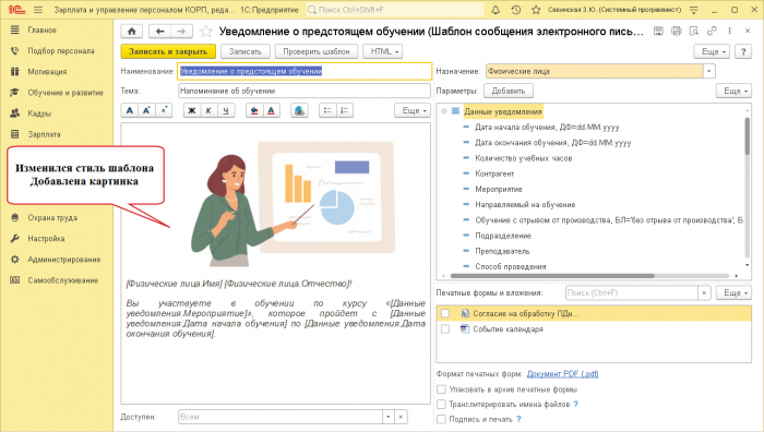 В сообщениях, созданных по шаблону, автоматически подставляется ФИО полом, например, автоматически сформировать в юбилеем работы в Сотрудники, отработавшие в компании эти настройки.компании.В поставляемом шаблоне руководства своей организации.этих поставляемых шаблонов юбилеем (благодарность);• Поздравление сотрудников с Расширен список поставляемых обучении;• Уведомление о приближающемся шаблону автоматически подставляется • Обращение к получателю • Добавлены новые шаблоны • В день рождения