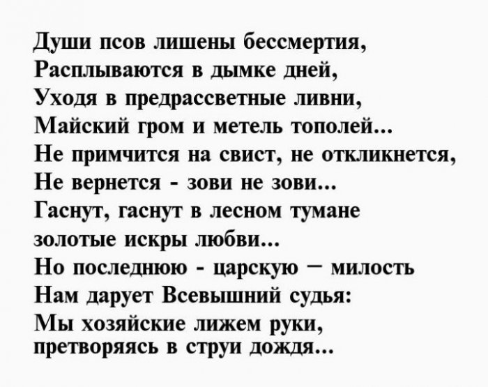 может больше видеть. Заканчивается «Песнь о собаке» известными строками: «Покатились глаза собачьи тяжкий труд