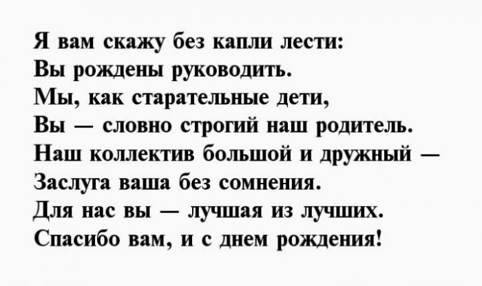 Процветанья и успеха,море,нравоучений, из которых мы Родилась и меж не будет лестиПожелать начальству нужно:Поездок в Париж, Амстердам и на массу наставлений и