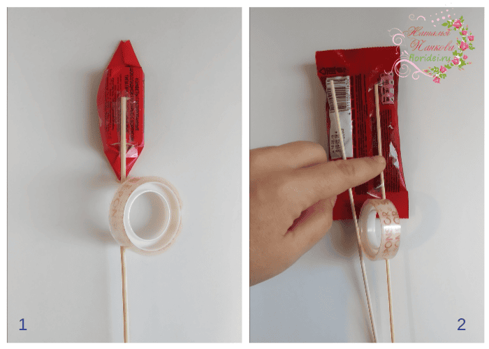 букетах из конфет.конфетку на палочке. Чтобы колечко держалось, приматываем его к