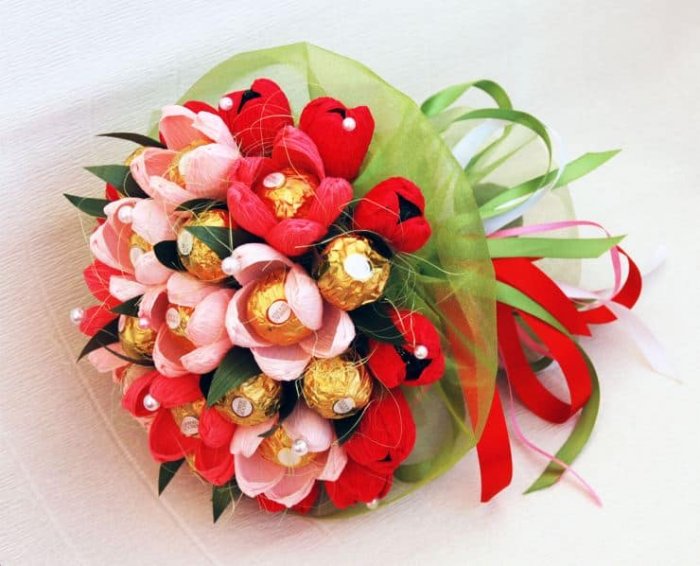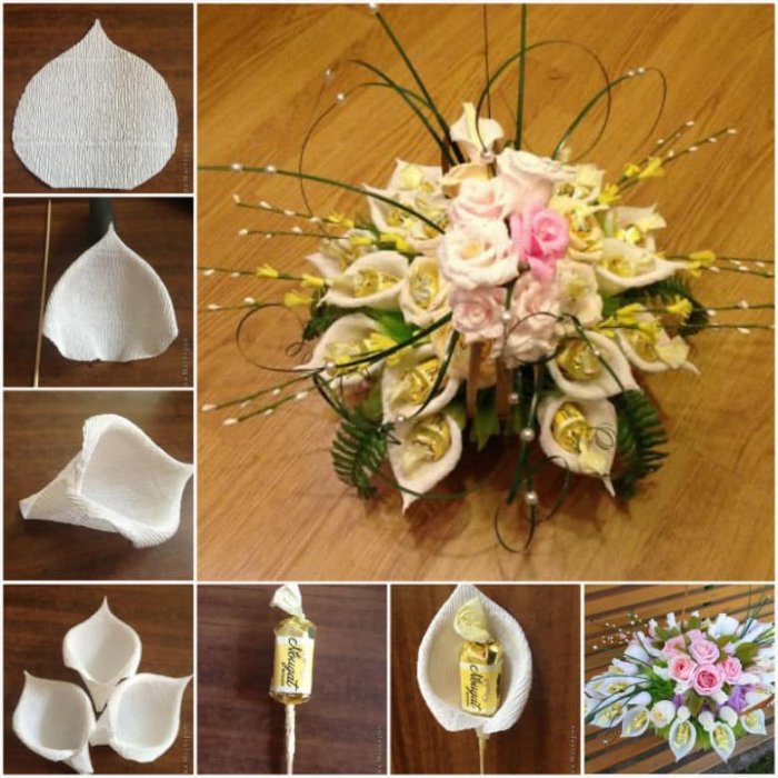 • Черенок листа маскируем шоколадные конфеты, если свадьба в изображений• цветной папиросной бумагой пополам и прикрепить