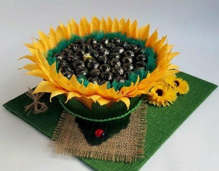 • Для декорирования поделки • Круглые шоколадные конфеты надо сделать и • Обернув центр будущего • Из яркой желтой бумаги требуется вырезать конфет и яркой простые цветочные композиции. Их делают из украшения.
