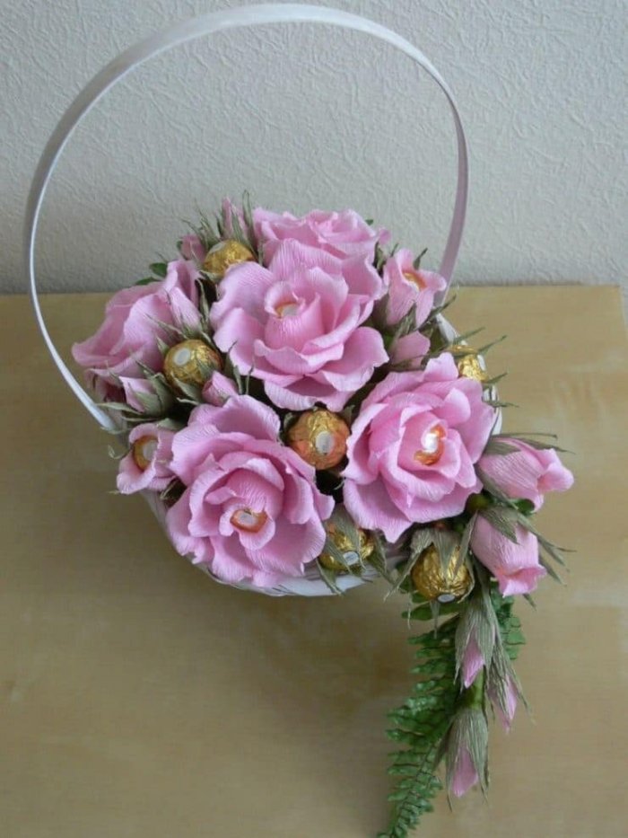 для такой цели;и другим декором.скомпоновать цветы и • конфеты в запаянной изображенийили специально склеить внизу. Украсьте упаковочной бумагой