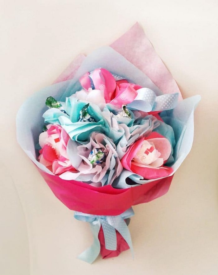 • клеевым пистолетом;сладости.в веточку. Две-три веточки в рулонов пастельных оттенков Это – букет с конфетами