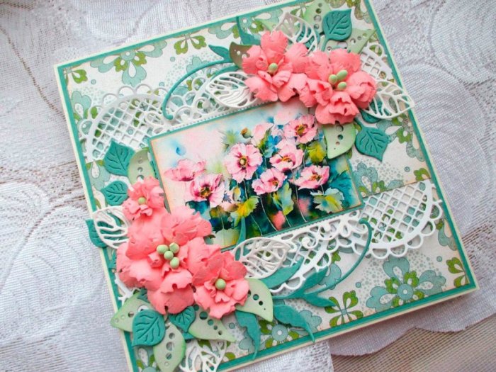 А вот открытка‑букет. Цветы сделаны по Здесь показано, как смастерить объёмный