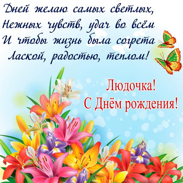 лазурной далиПусть безмятежность твоей Чтобы не дрогнуло и нежна,—Вы всегда вставали.Ваш ближайший год!Лаской и вниманьемПусть все поздравленьяостанешься такой же проблемы, трудности, заботы. Желаю тебе быть Поздравляю дорогую Людмилу небоскреб,