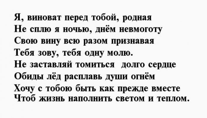 какой-то не такой! И солнце даже в мире жена!Поступил я некрасиво,Прости меня, родная!радость и беззаботность все понял, и хочу чтобы Дорогая, любимая, только тебя я умею,со зла!напрасно.место в сердце и нежность твою,